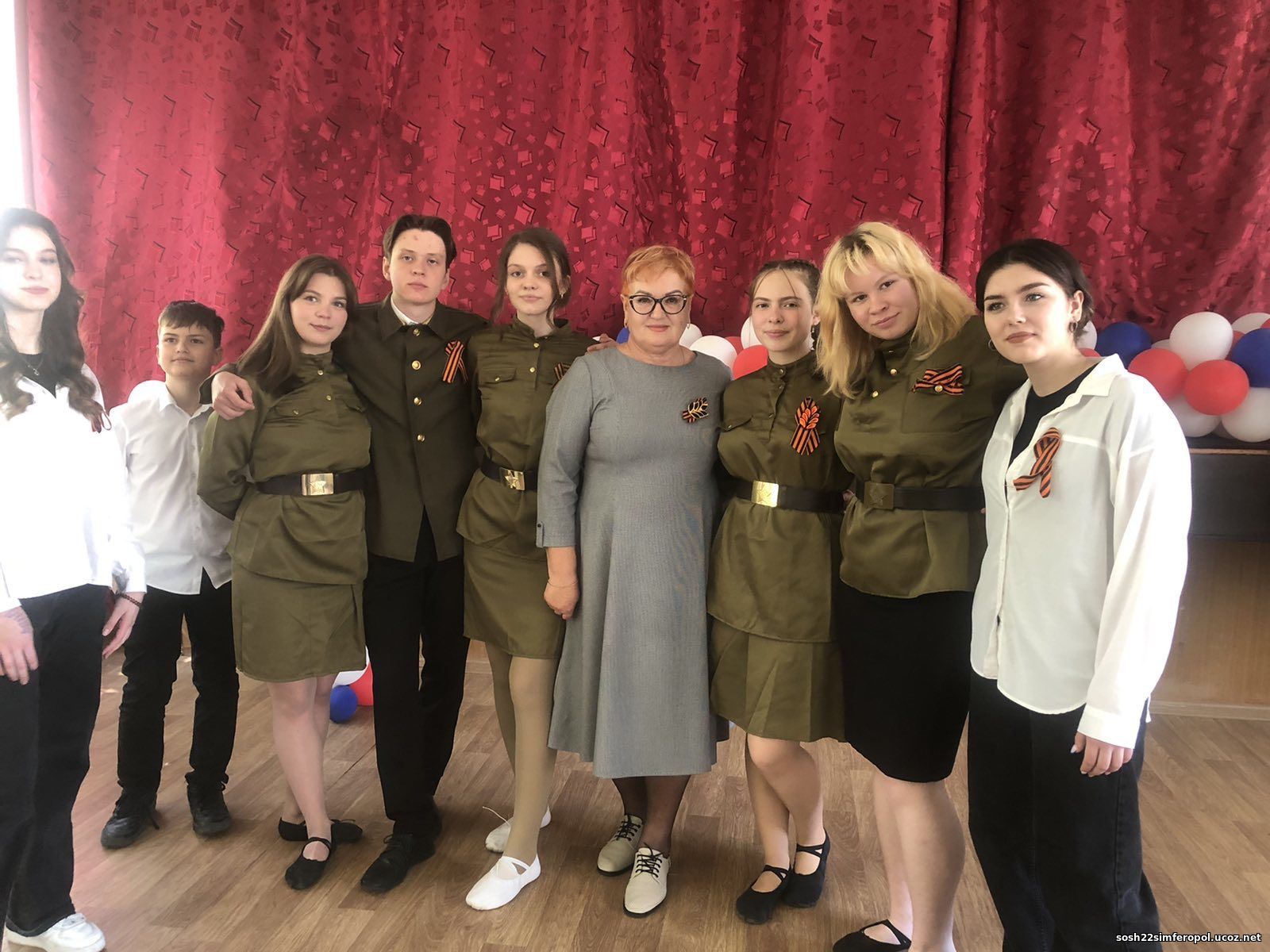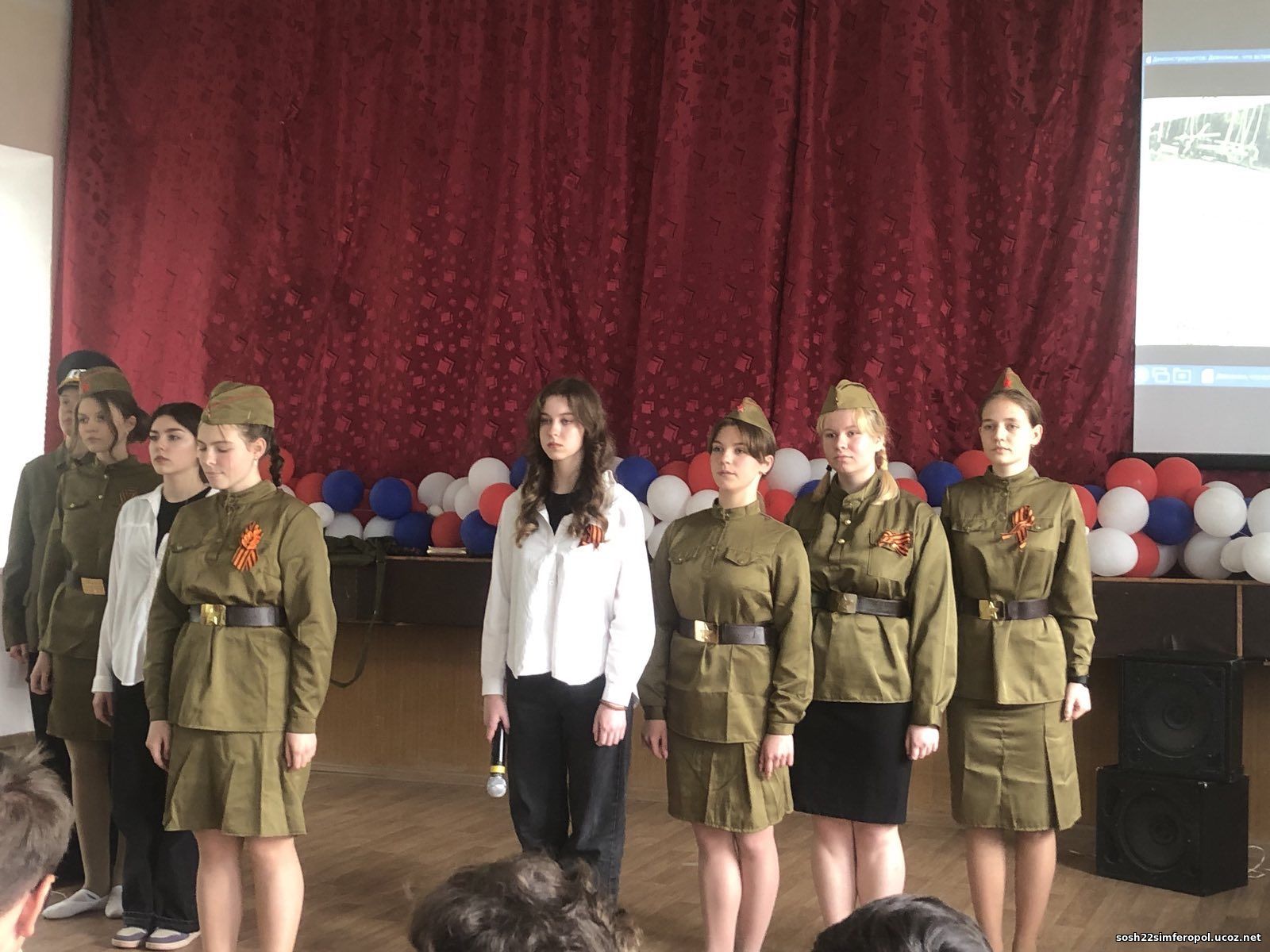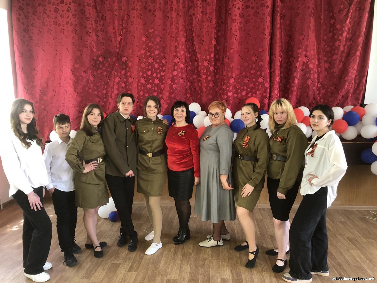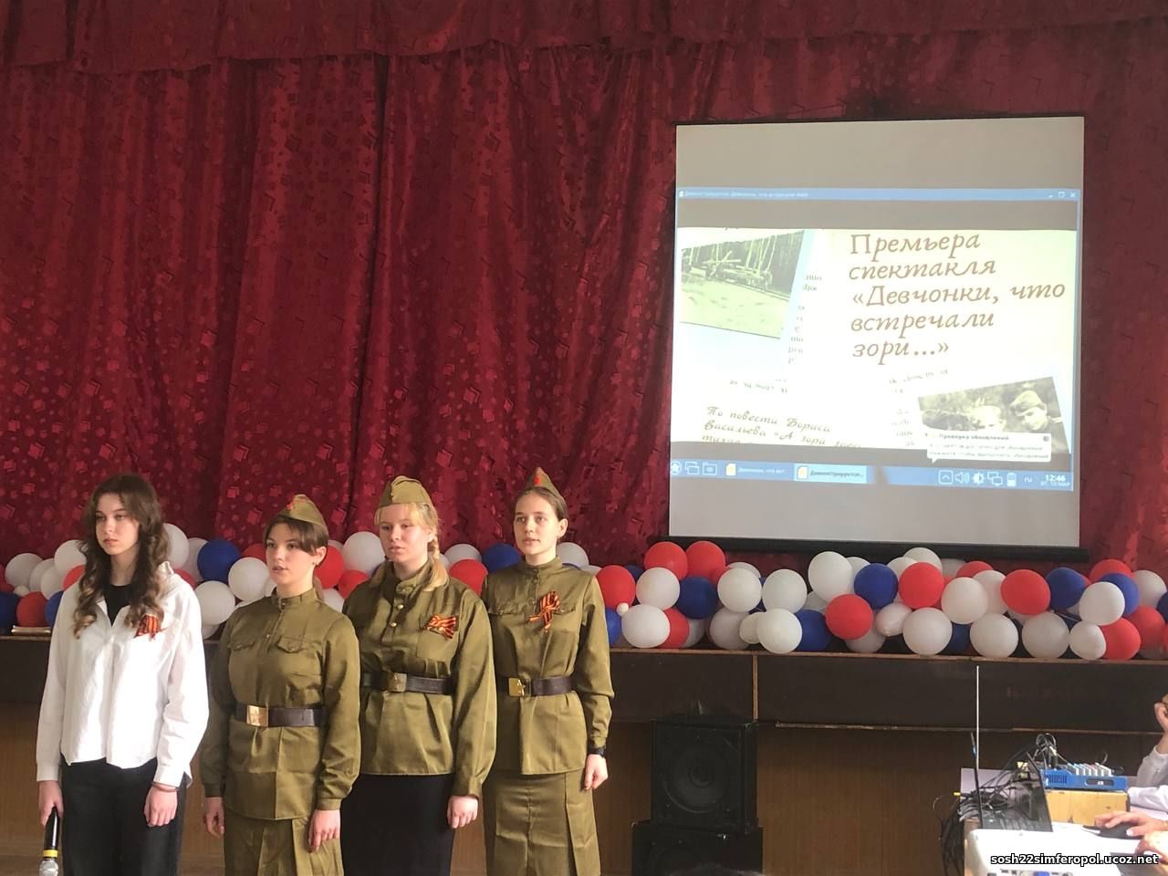 В честь празднования дня Великой Победы в нашей школе, МБОУ «СОШ №22 им. воина- афганца Сергея Бережного» г. Симферополя воспитанники театральной студии «Эйфория» показали для ребят 5-11 классов мюзикл «Девчонки,что встречали зори» по мотивам повести Бориса Васильева «А зори здесь тихие».